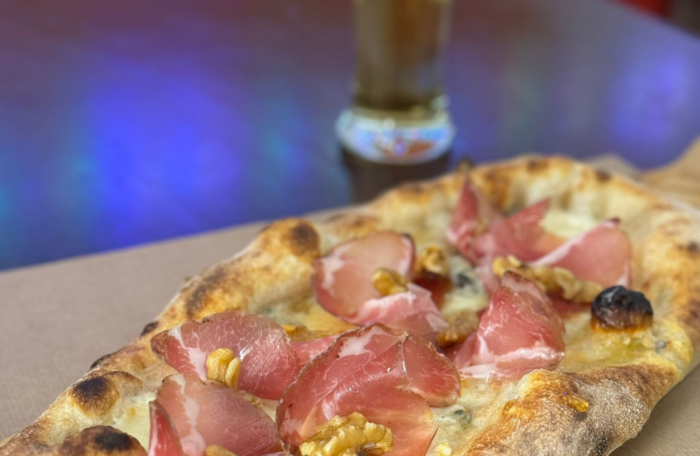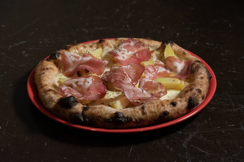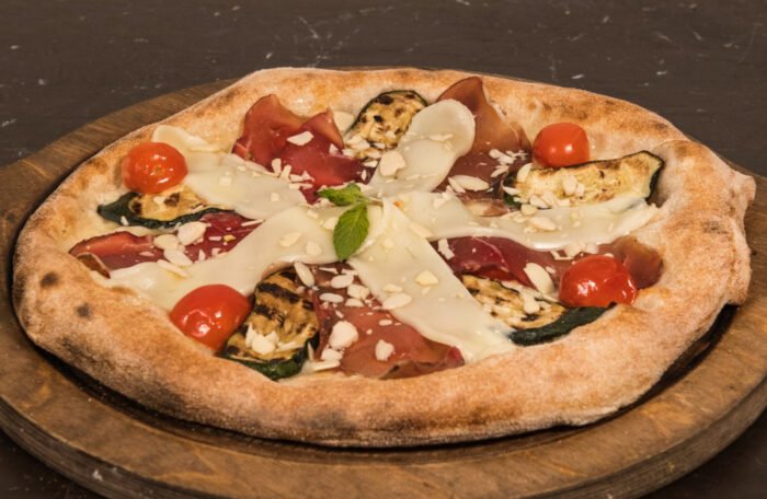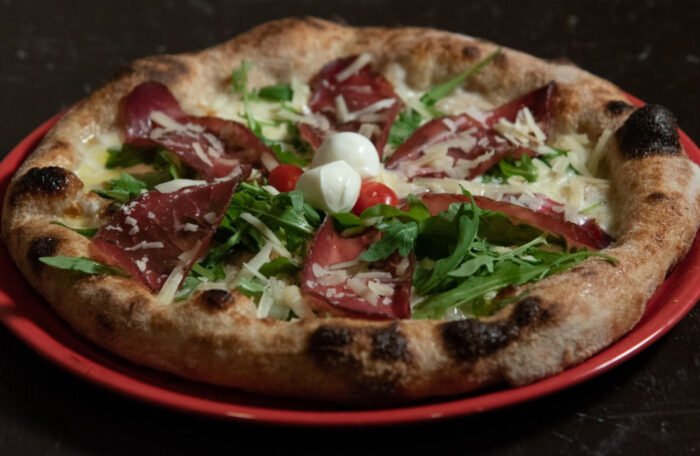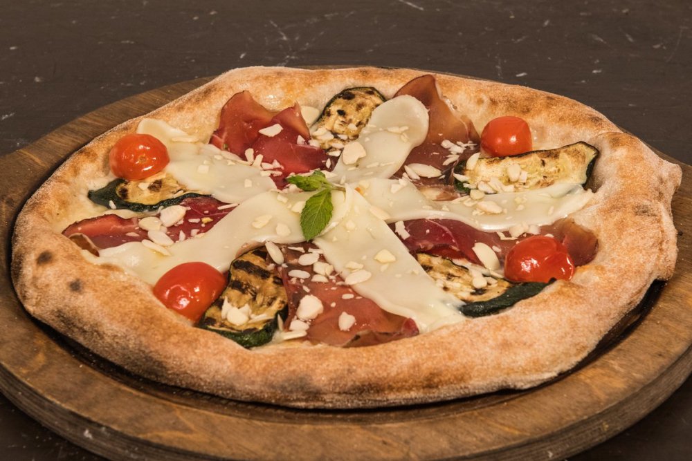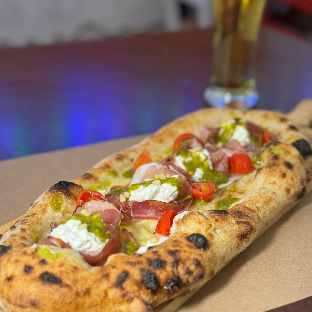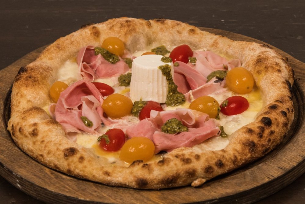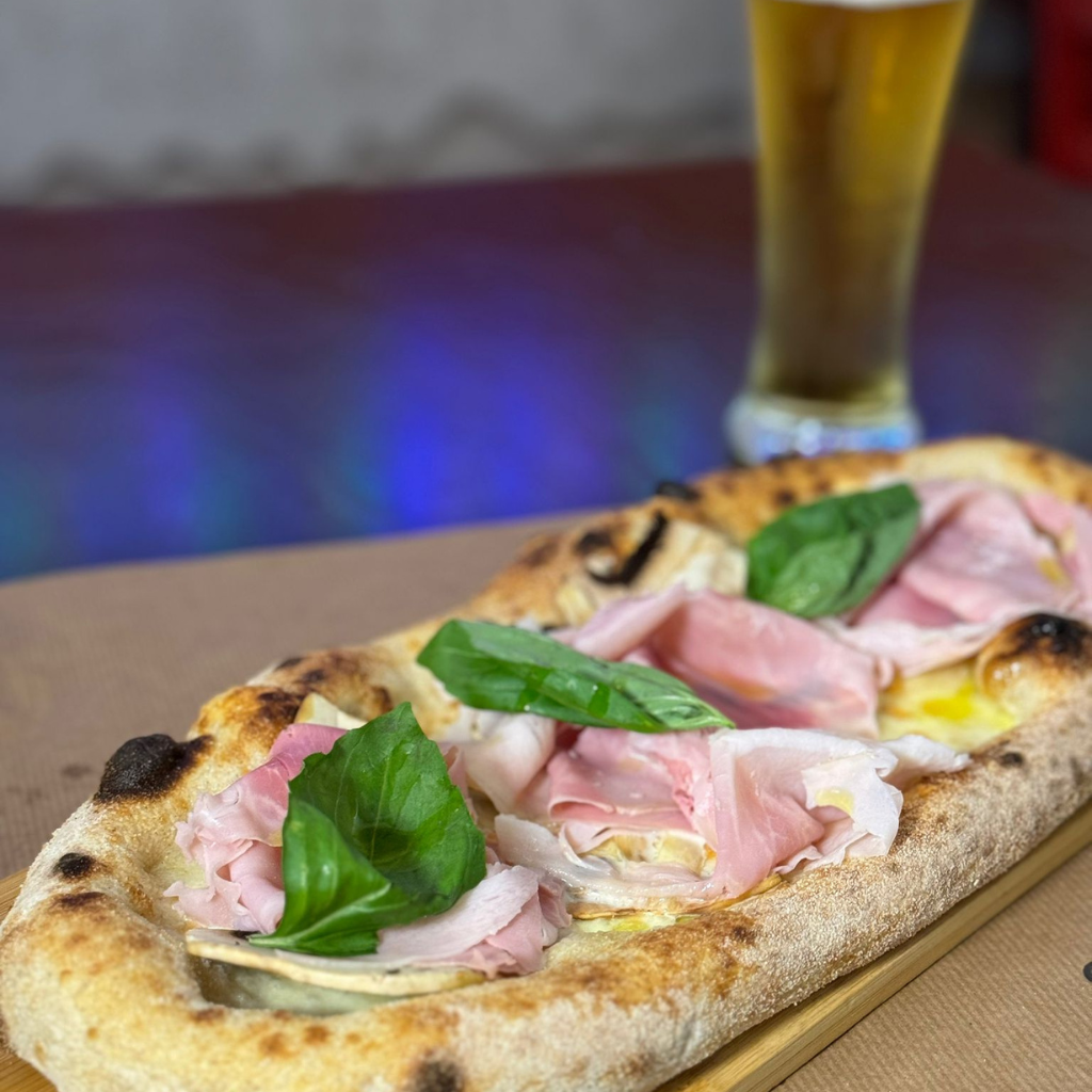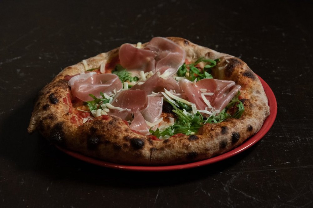 Salsa di pomodoro 100% italiano, Mozzarella di bufala DOP, Prosciutto Crudo di Parma DOP 24 mesi Levoni, Rucola, Scaglie di Parmigiano, Olio extravergine d'oliva BIO Sicilia