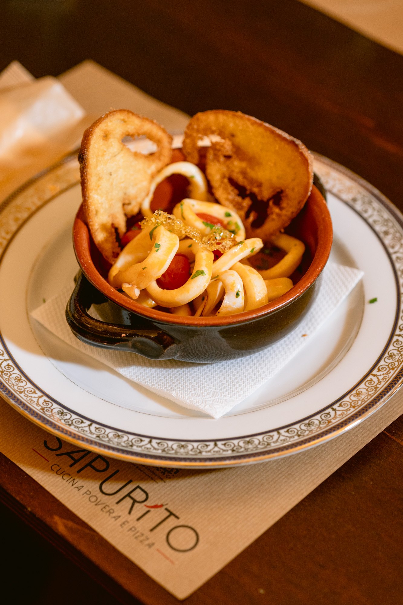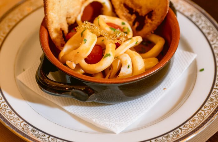 Anelli di Totani, Salsa di pomodoro, Aromi, Pepe, Olio extravergine d'oliva all'Aglio, Prezzemolo, Sedano