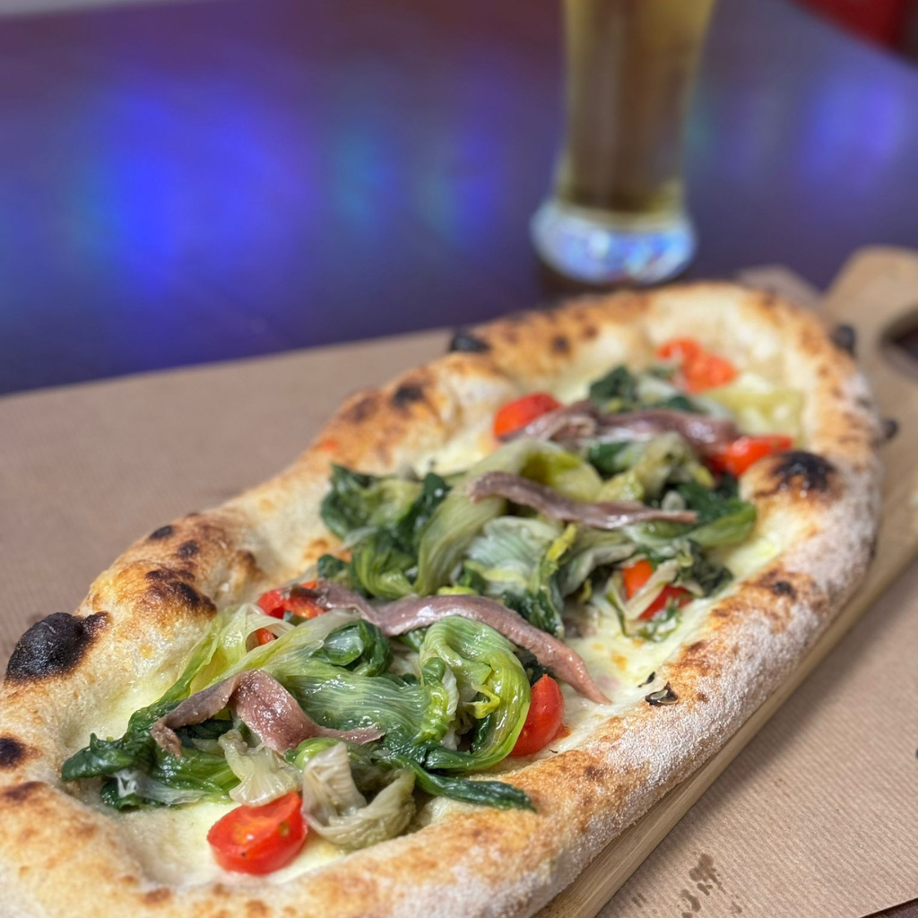 Mozzarella di Latte vaccino, Primosale siciliano, Scarola saltata, Alici di Cetara, Pomodoro ciliegino, Peperoncino, Olio extravergine d'oliva BIO Sicilia