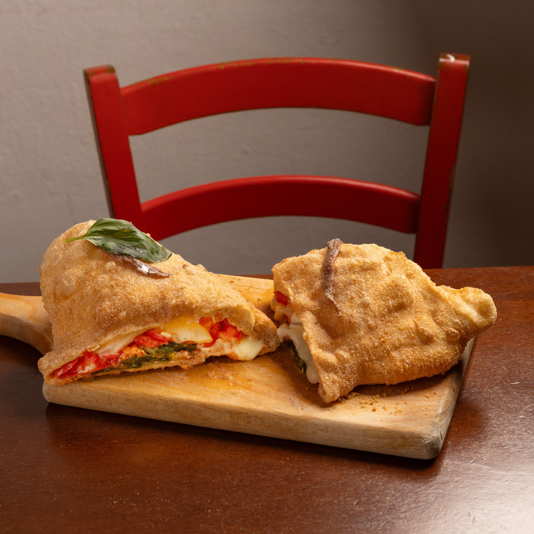 Calzone fritto ripieno di Primosale siciliano, Alici di Cetara, Scarola saltata, Pomodoro a fette, Peperoncino, Pepe nero, Olio extravergine d'oliva BIO Sicilia