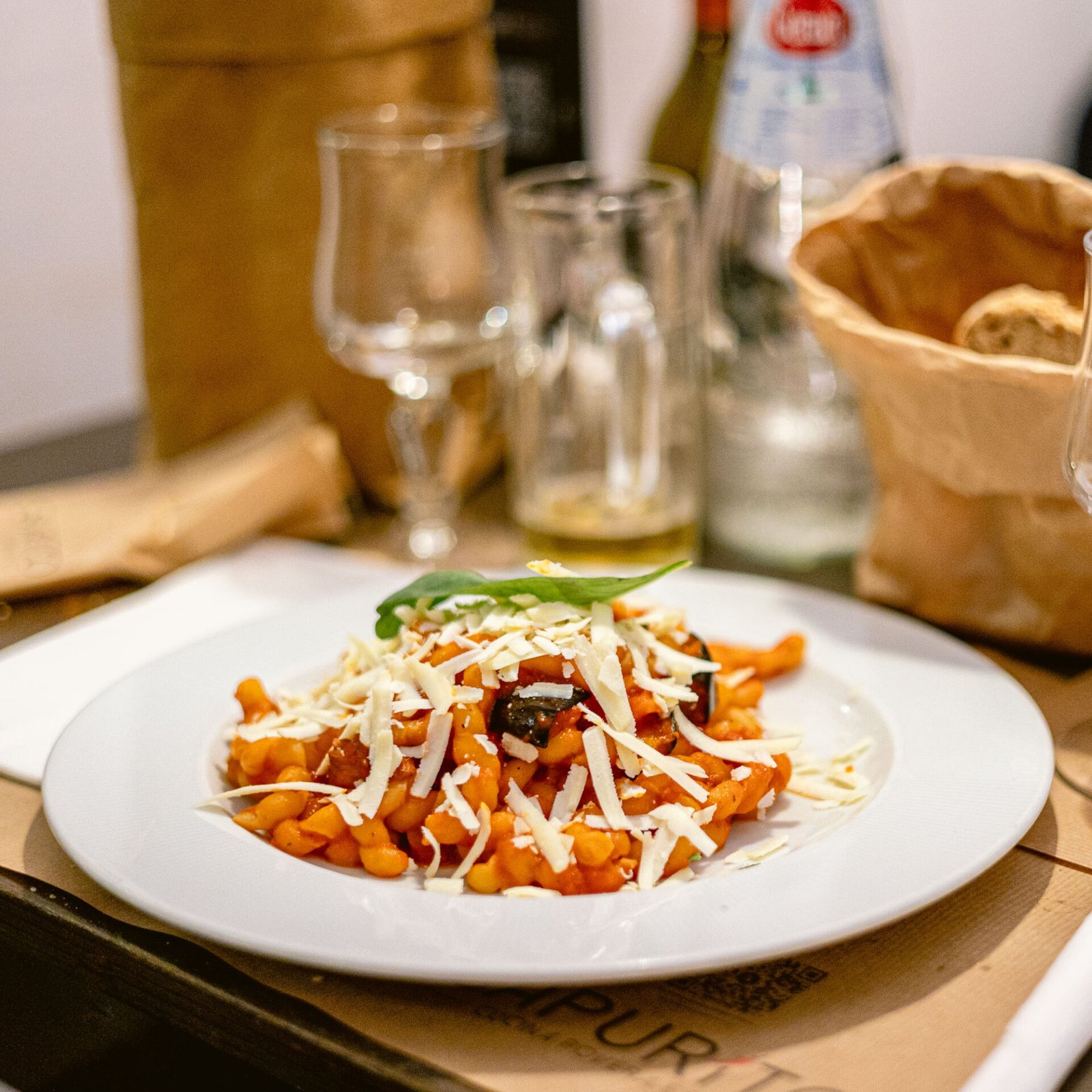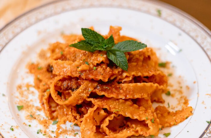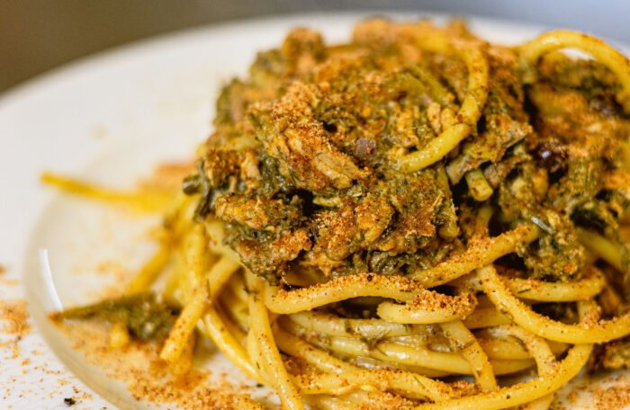 Caserecce, Sarde fresche, Finocchietto di montagna, Acciughe di Castelvetrano, Passoline, Pinoli, Cipolla, Concentrato di Pomodoro, Pan grattato tostato