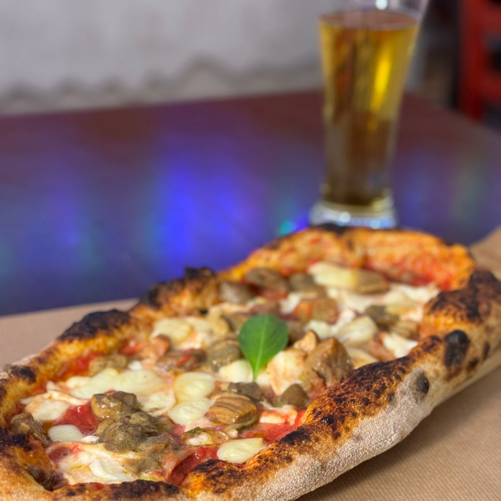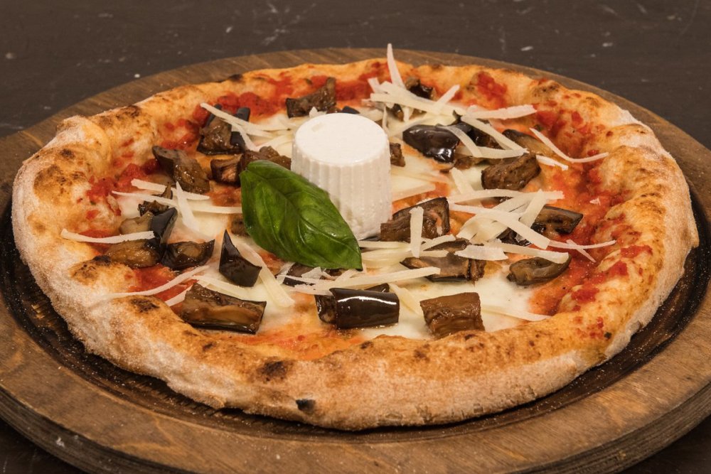 Salsa di pomodoro 100% italiano, Mozzarella di Latte vaccino, Melanzane nostrane fritte, Scaglie di Parmigiano, Ricottina di bufala, Olio extravergine d'oliva BIO Sicilia