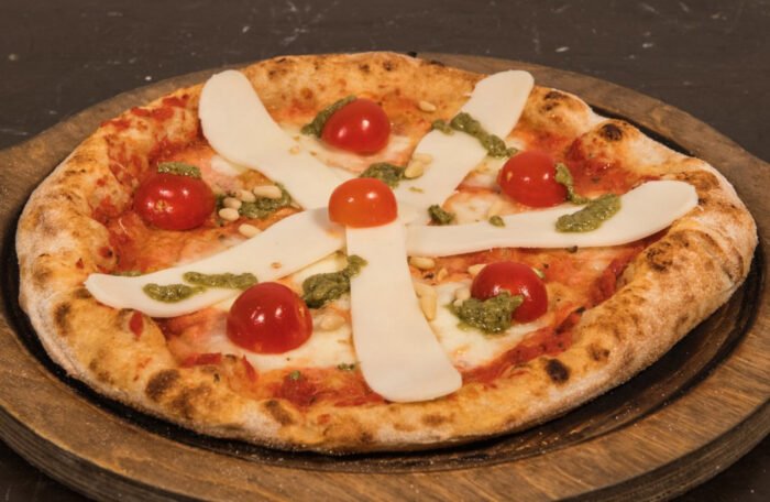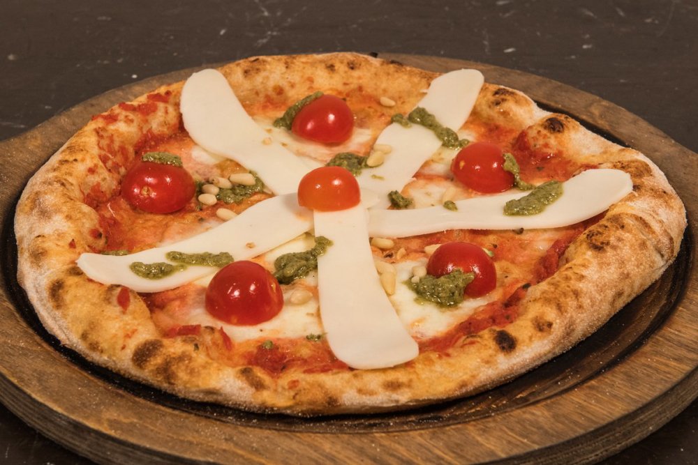 Salsa di pomodoro 100% italiano, Mozzarella di Latte vaccino, Pomodoro ciliegino, Vastedda del Belice, Pesto di basilico, Pinoli, Olio extravergine d'oliva BIO Sicilia