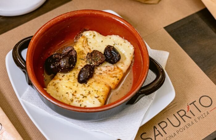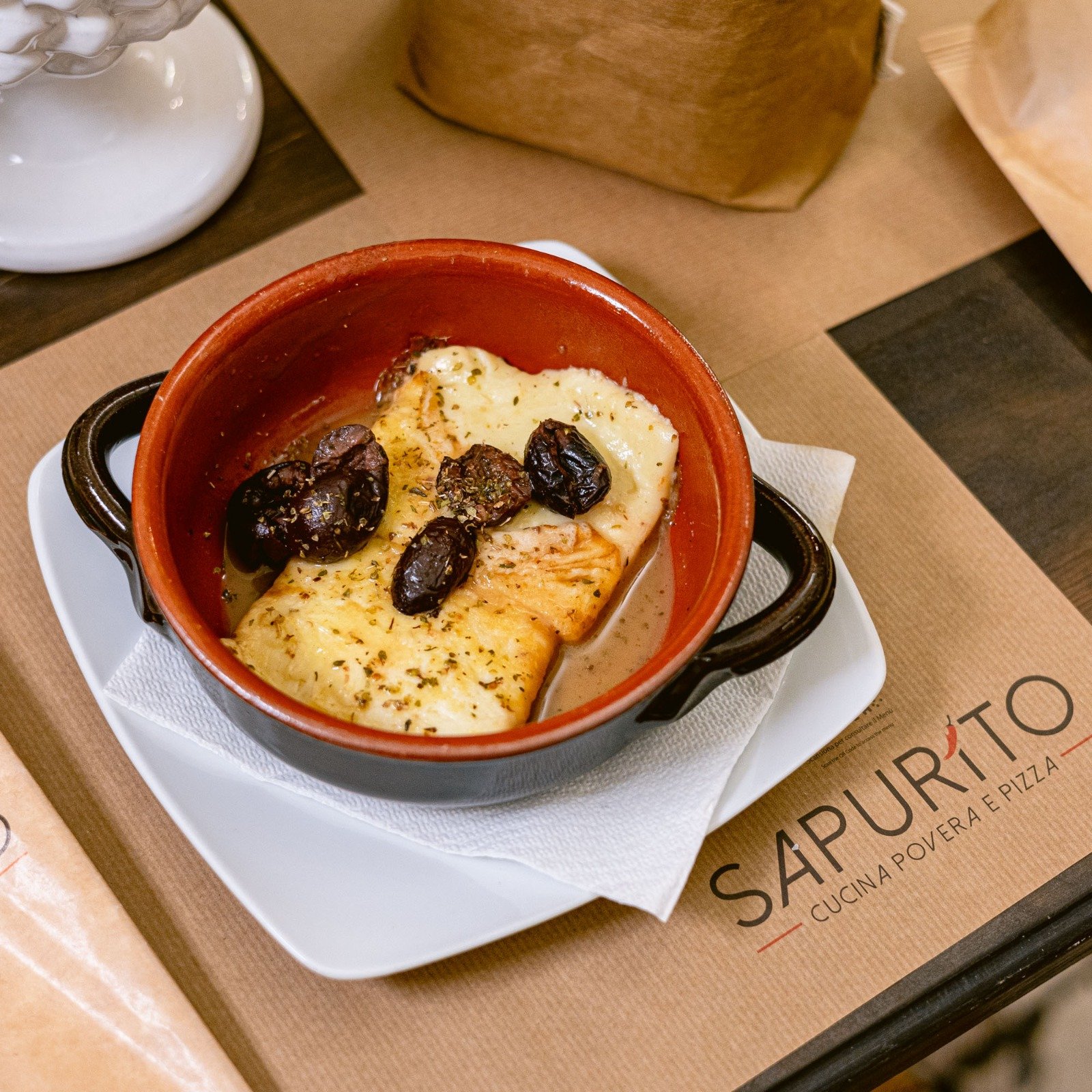 Caciocavallo semi-stagionato cotto con aceto, olive nere e origano.