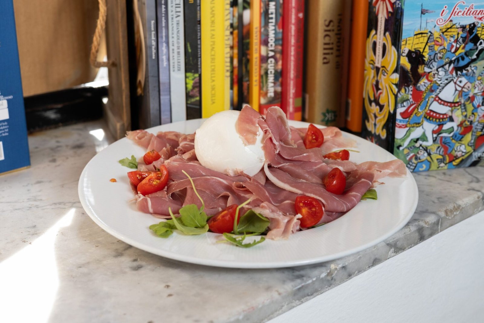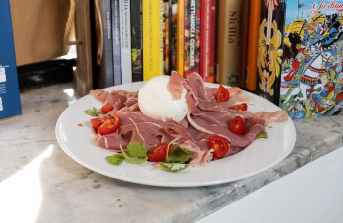 Mozzarella di bufala DOP, Speck, Stracciatela di bufala, Pesto di pistacchi, Pomodoro ciliegino, Olio extravergine d'oliva BIO Sicilia