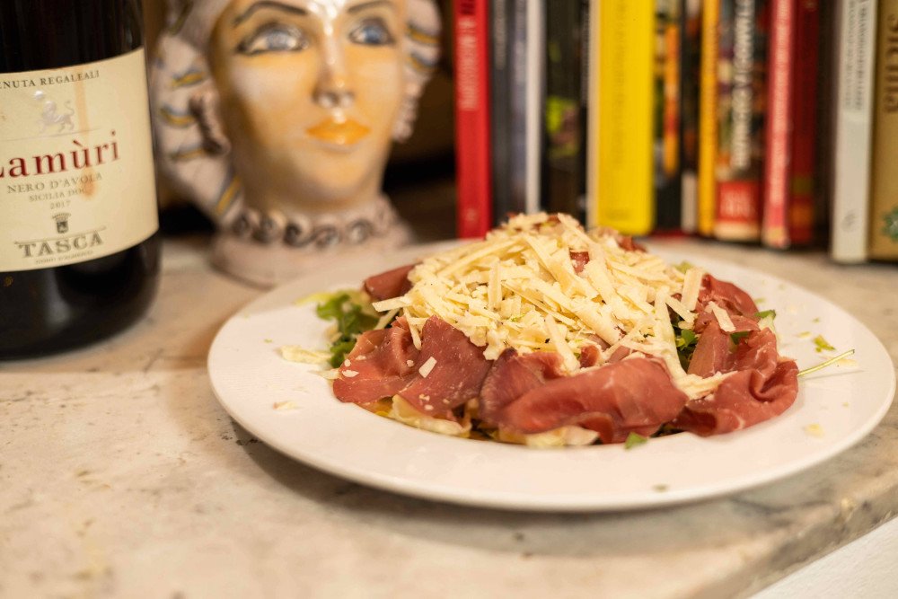 Insalata verde, Rucola, Bresaola Busambrina di Vacca Cinisara, Scaglie di Parmigiano, Scorza di limone