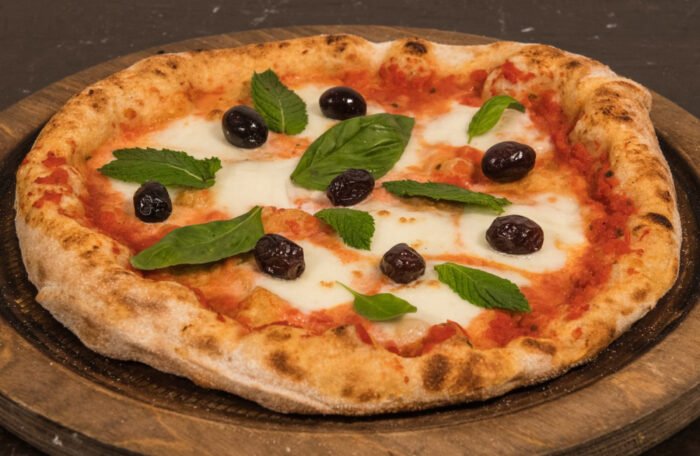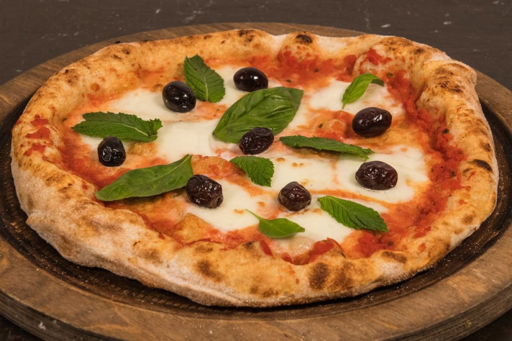 Salsa di pomodoro 100% italiano, Mozzarella di bufala DOP, Olive nere, Mente, Basilico, Olio extravergine d'oliva BIO Sicilia