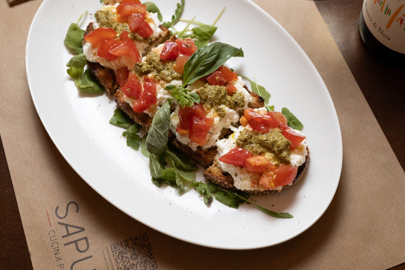 Pomodoro ciliegino, Mozzarella di bufala DOP, Pesto di Basibasilico, Olio extravergine d'oliva IGP Sicilia